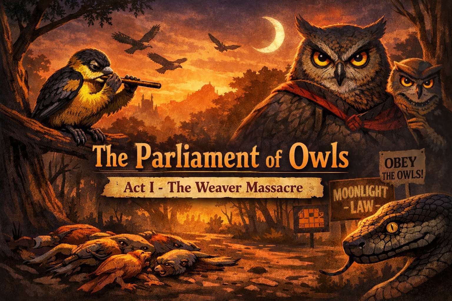 It seems like the owls think they run things because of their eyes, the biggest ones so they see better at night or something. Red String brings that up, and also how they protect everyone from stuff like snakes. But Osogo isnt buying it, he points out that owls kill day birds, make laws just for themselves, and use animals like python to execute birds the parliament condemns.